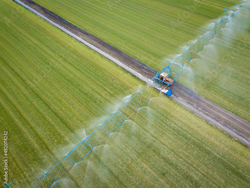 Tractor sprays the field with chemicals. Aerial drone photo. Russia.