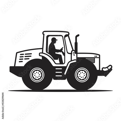 Tractor with driver silhouette in black and white, representing agriculture, with copy space