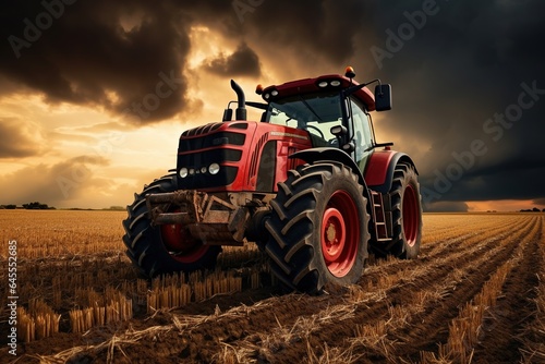 Tractor with harrow in the field against a cloudy sky.