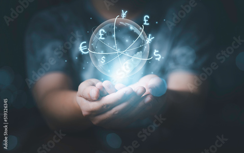 Trader hands holding virtual word with currency symbol include US dollar Yuan Yen Pound sterling and Euro for global forex and currency exchange concept.