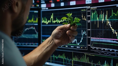 Trader with plant holding growing stock in front of the virtual screen for investment growth concept