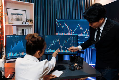 Trading business partners discussing on dynamic stock exchange statistic on pc screens taking note on paper, comparing with high or low point on currency graph at night neon modern office. Infobahn.