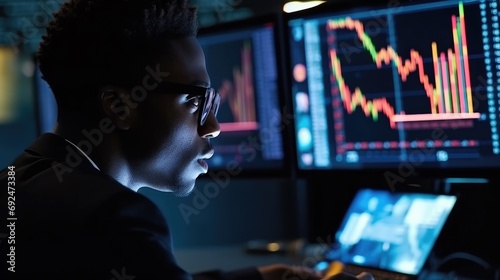 Trading cryptocurrency and securities. A young financial analyst in glasses works in front of a laptop monitor. Track quotes in real time