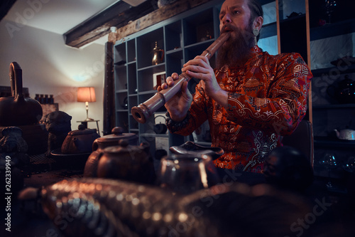 Tradition, health, harmony. Chinese tea ceremony. Tea master in kimono performs in the dark room with a wooden interior, playing on a bamboo flute