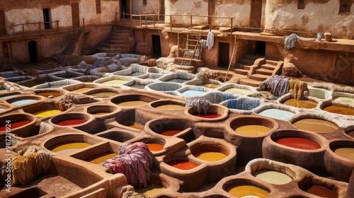 Traditional ancient leather processing techniques. Tannery with many stone vats filled with colorful dye.