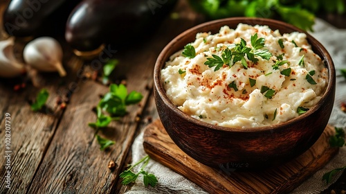 Traditional arabian eggplant dip baba ganoush with herbs and smoked paprika on a wooden background : Generative AI