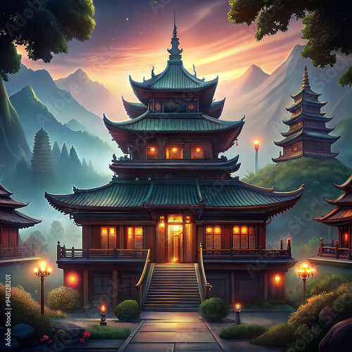 Traditional Asian pagoda illuminated at twilight with mountains in the background