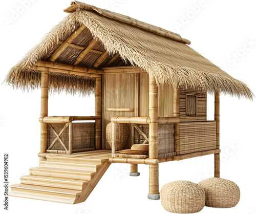 Traditional bamboo hut with thatched roof and wooden porch steps isolated on a transparent background, cut out