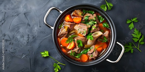 Traditional beef broth with vegetables and bones gently cooking in a pot. Concept Homemade Soups, Comforting Meals, Hearty Recipes, Nourishing Broths