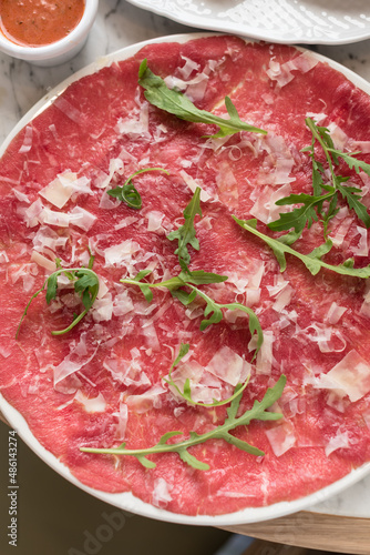 Traditional Beef Carpaccio Garnished with Parmesan Cheese and Fresh Arugula Leaves