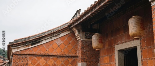 Traditional Brick Building with Curved Roof and Bamboo Lanterns