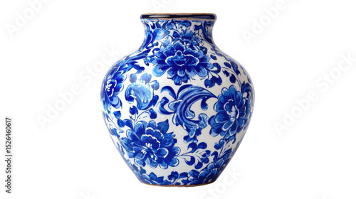 Traditional ceramic vase with a hand painted blue floral pattern isolated on a transparent background, showcasing craftsmanship and artistic detail
