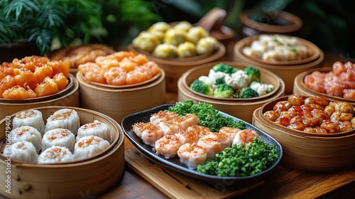 traditional chinese dim sum plates arranged on a table with bamboo basket