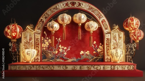 Traditional Chinese Festival Display Featuring Elegant Lanterns and Decorative Panels Set Against a Rich Red Background