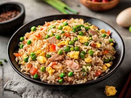 Traditional Chinese fried rice with vegetables and eggs. Featuring a savory and satisfying dish. Highlighting the texture and flavors of the fried rice. Ideal for food and culinary themes.
