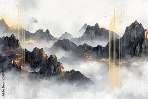 Traditional Chinese Landscape Painting with Divine Mountains and Golden Accents for decoration or cultural reference