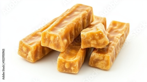 Traditional Chinese peanut candies shaped like bars, golden and crunchy, isolated on white background