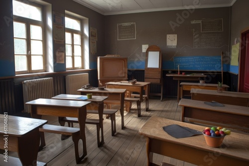 traditional classroom with wooden desks and chalkboard, ready for the school year, created with generative ai