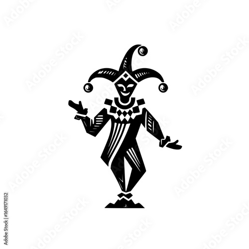 Traditional clown figure performing at a festive celebration in a vibrant atmosphere with lively decorations and colorful attire