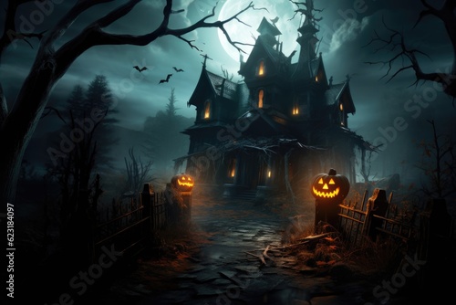 Traditional Colored Sketch Drawing of Spooky House with Scary Pumpkins Halloween Background generative AI.