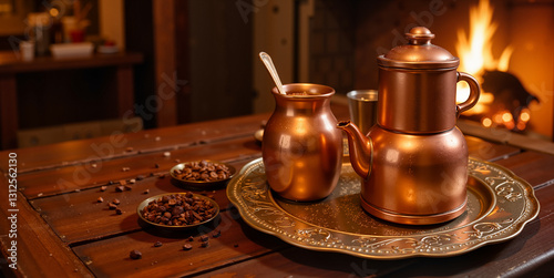 Traditional copper tea set with dates for Ramadan celebration for cultural blogs, religious holiday content, Middle Eastern cuisine websites, and festive decoration ideas