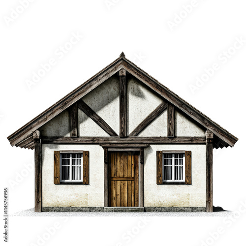 Traditional cottage house with wooden beams and shuttered featu a steep gabled roof and rustic design in a classic countryside style