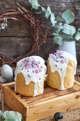 Traditional Easter cake with glaze and decorated mini meringue. Wooden background, side view, pink, blue, green, eggs, eucalyptus