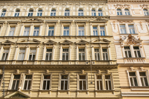 Traditional facade of buildings, exterior of buildings in Prague. Close-up of beautiful historic buildings standing tightly together