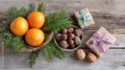Traditional festive arrangement with seasonal treats and pine branches on natural background.