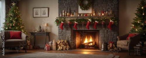 Traditional fireplace with a decorated Christmas tree and hanging stockings, tradition, xmas
