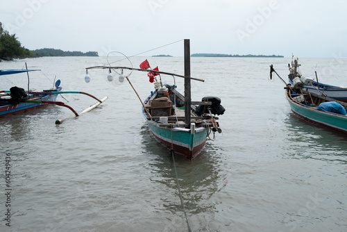 Traditional fishing boat on the beach during morning mist over water