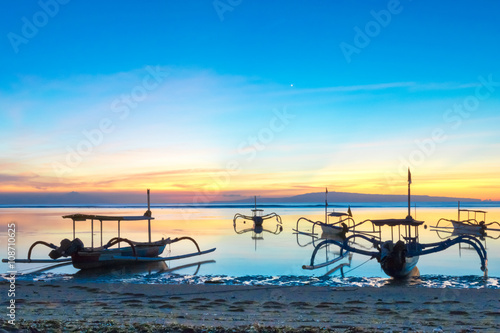 traditional fishing boats at sunrise. Sanur Beach, Bali, Indonesia.