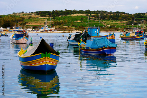 Traditional fishing boats luzzu in Marsaxlokk village in Malta, painted in bright colours – blue, red and yellow. The bow has a pair of eyes.