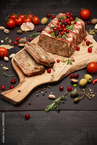Traditional French terrine covered with bacon on dark wooden background