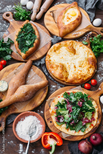 Traditional Georgian adjara khachapuri and Kolkh khachapuri on the table. Homemade baking. Top view. Flat lay