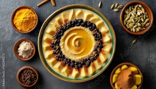 Traditional Ghanaian Dish with Milk, Atadwe, and a Colorful Arrangement of Toppings in Bowl