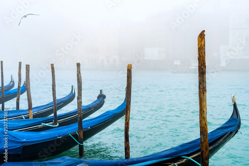 Traditional gondolas in Venice during a misty/foggy spring day, Italy.