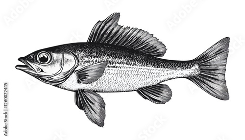 Traditional hand-drawn fish sketch with vintage etching and woodcut design