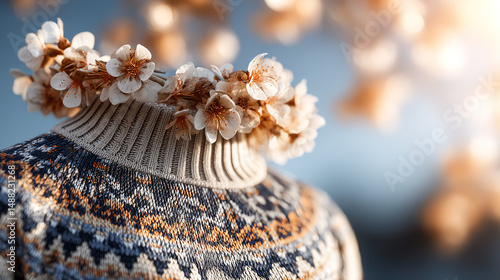 Traditional Icelandic wool sweater with intricate patterns and wildflower wreath, celebrating national heritage and nature's beauty.