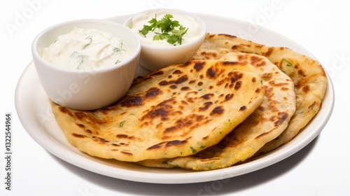 Traditional Indian aloo paratha potato stuffed bread served with yogurt on clean white background