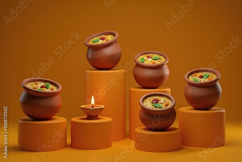 Traditional indian clay pottery with lamp and festive dishes on geometric pedestals.