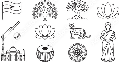 Traditional Indian Culture Icons Displaying Landmarks, Animals, and Cultural Elements.