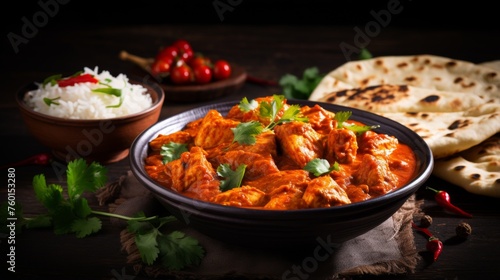 Traditional Indian curry dish, Chicken Tikka Masala, served with basmati rice and fresh naan bread on rustic wooden backdrop