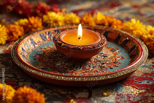 Traditional Indian Diya on Pooja Thali with Kumkum and Flowers