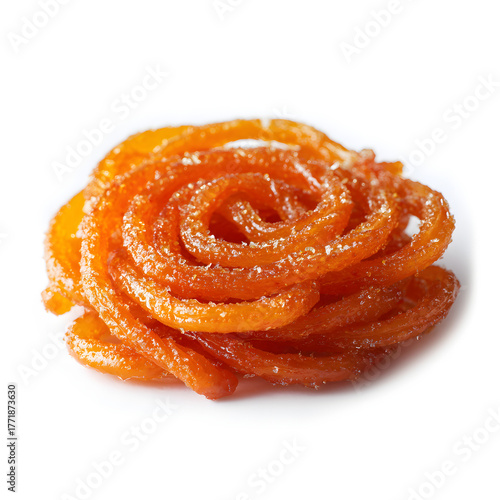 Traditional Indian jalebi sweet, deep-fried spiral dessert soaked in sugar syrup isolated on white background