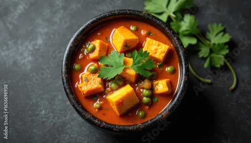 Traditional Indian Matar Paneer curry with green peas, cheese cubes in rich tomato gravy. Aromatic, spicy vegetarian dish, garnished with fresh cilantro. Served in rustic black bowl for lunch dinner.