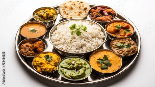Traditional Indian thali featuring an assortment of curries, dal, rice, and roti, arranged on a silver tray with vibrant colors and textures, set against a white backdrop.
