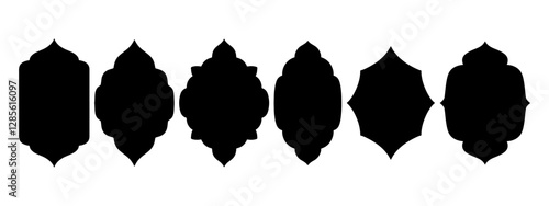 Traditional islamic window shapes in oriental style. Set of black silhouettes eid mubarak decorative arches. Arabic muslim architecture design elements, ramadan frames