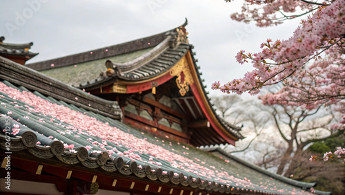 Traditional Japanese Architecture Surrounded by Cherry Blossom Trees in Full Bloom Under a Cloudy Sky