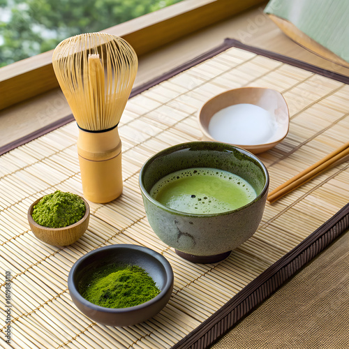 Traditional Japanese Matcha Tea Set with Bamboo Whisk and Zen Backdrop